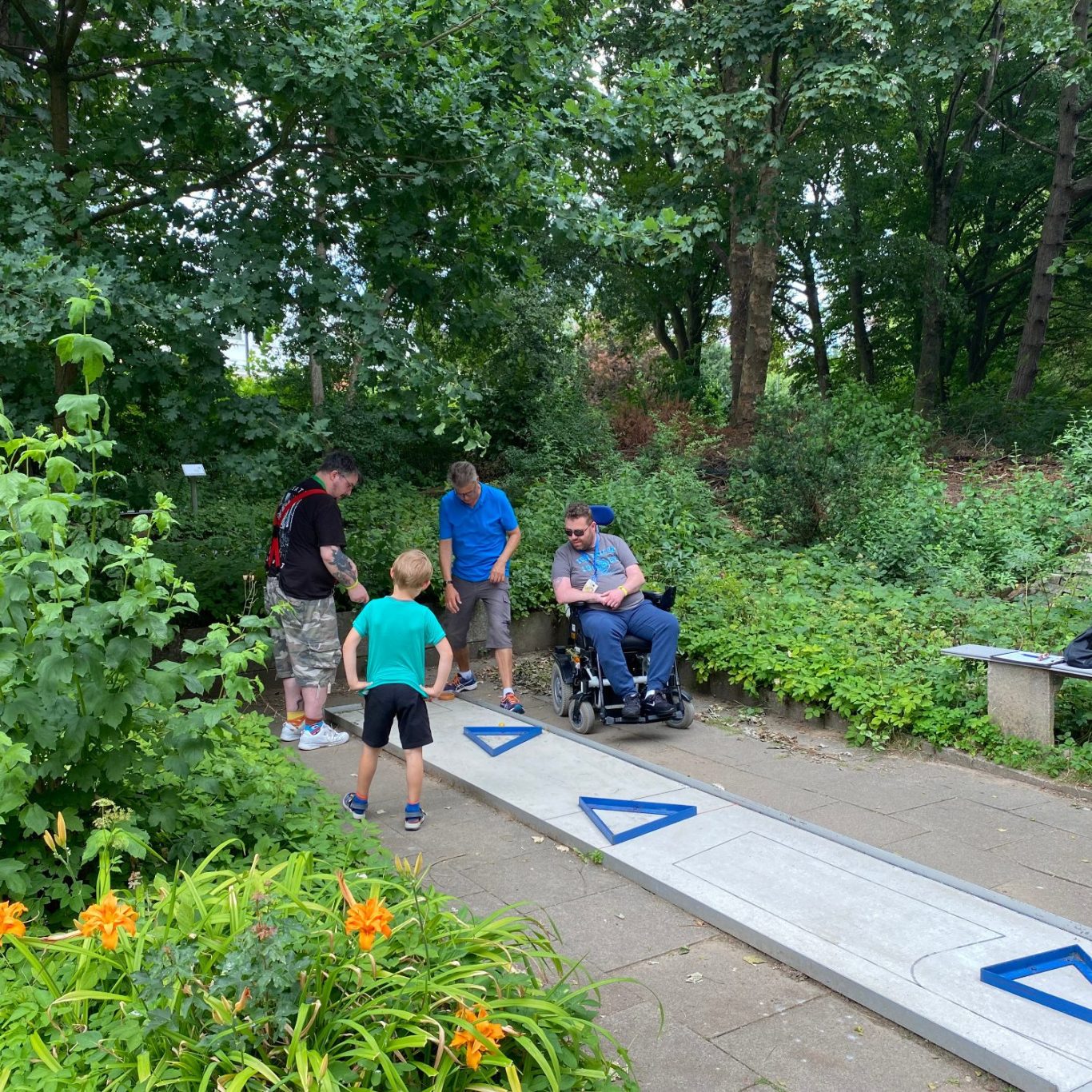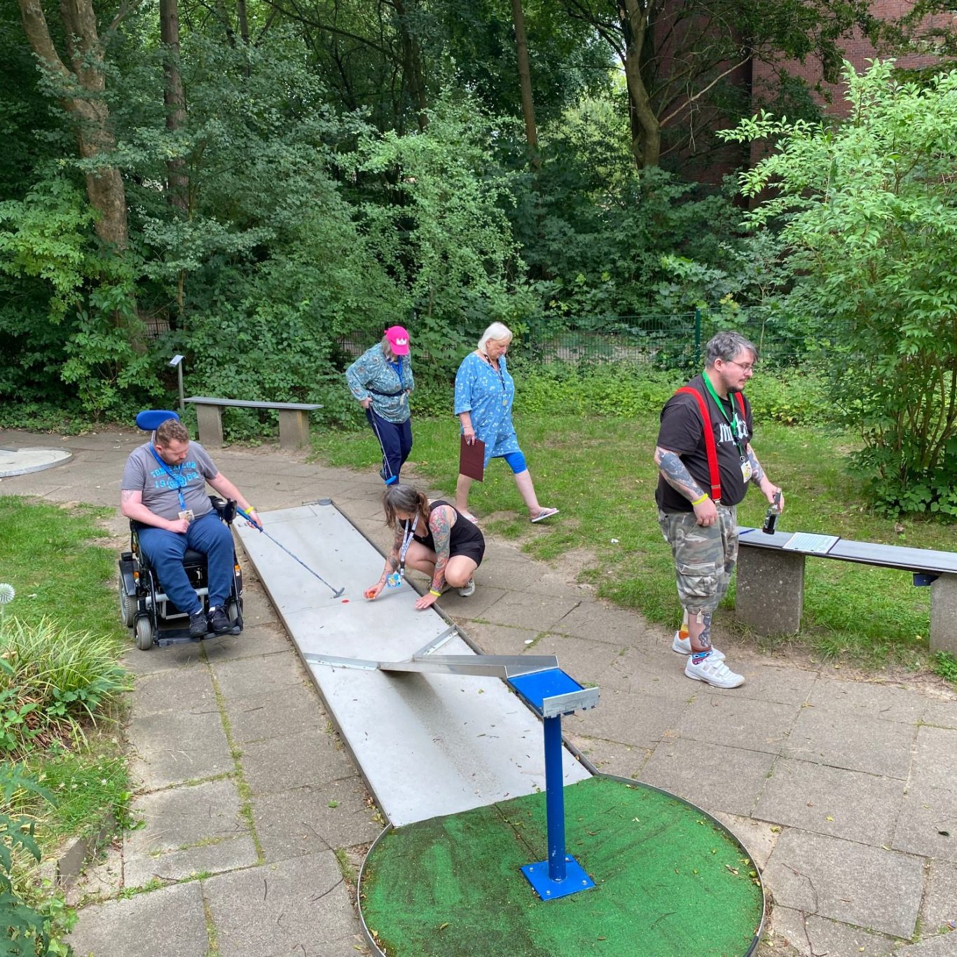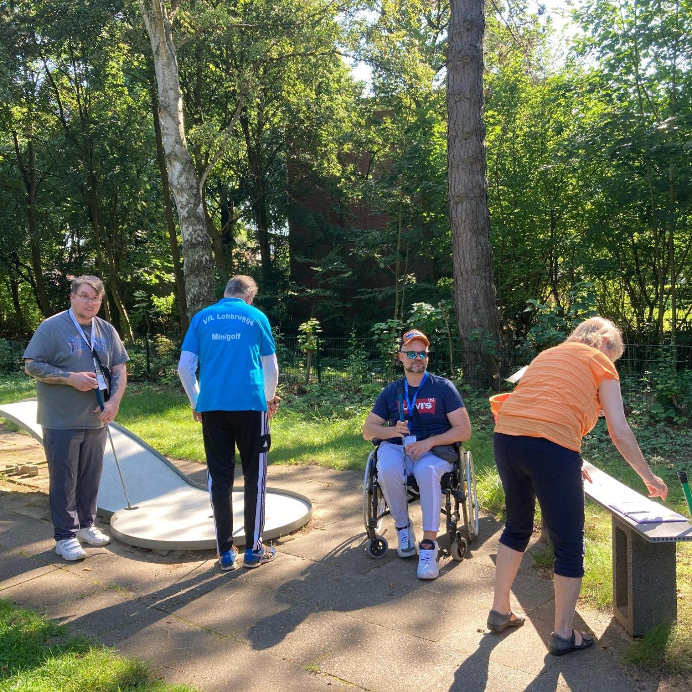 Im Juli 2023 fuhren wir raus ins Grüne nach Lohbrügge. Dort hatten wir uns auf der Minigolfanlage mit den Profispielern des VFL Lohbrügge verabredet. Diese erklärten uns die Regeln und unterstützen uns mit Tipps und Tricks. In kleinen Teams spielten wir die 18 Bahnen mit unterschiedlichen Hindernissen. Die Mittagspause nahmen wir zusammen bei Currywurst, Pommes, Kuchen und Eis auf der Terrasse des dortigen Kiosks ein, Im Anschluss fand die Siegerehrung mit Preisverleihung statt. Wir waren alle Sieger!